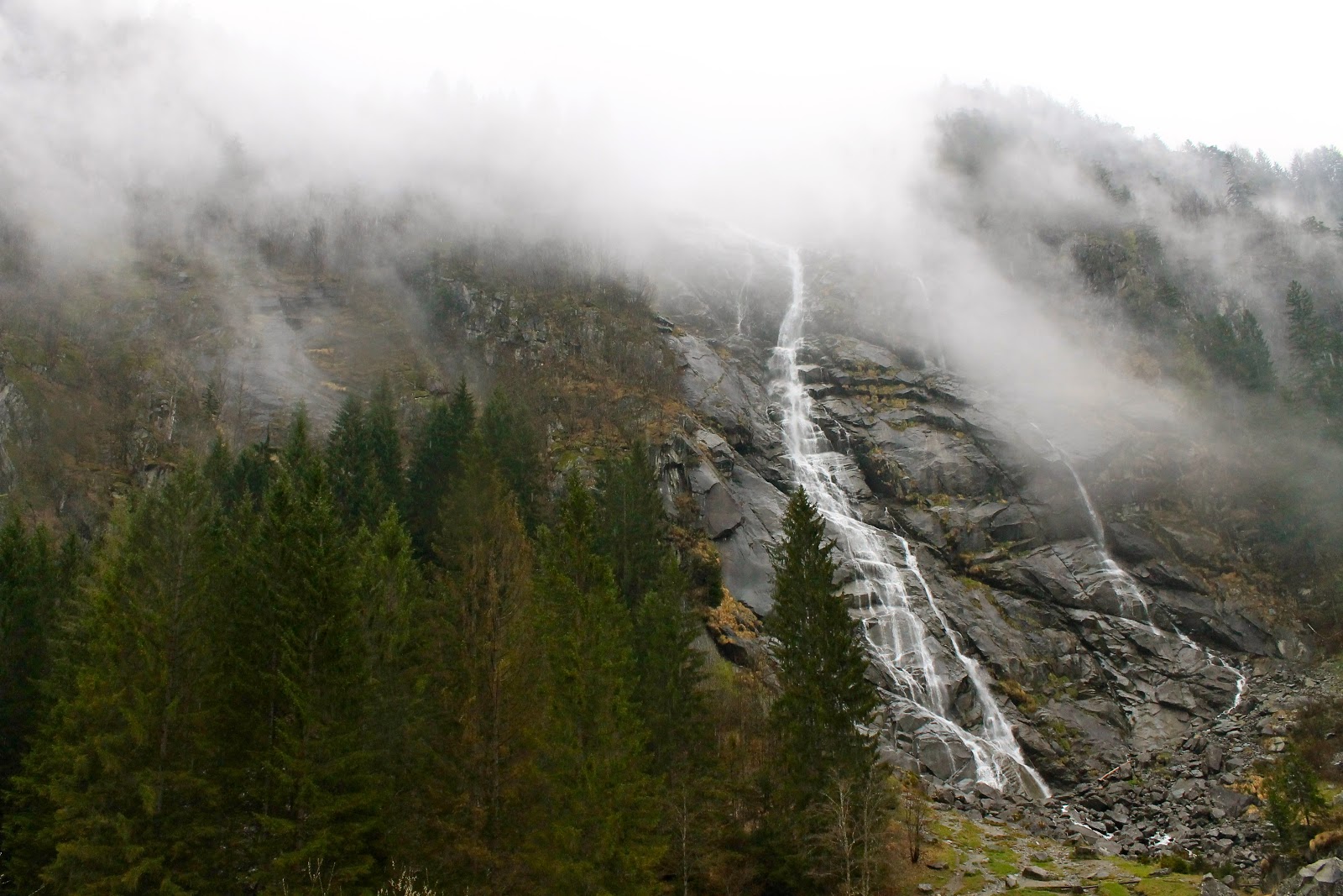 The next day, we were welcomed with cold(ish), rainy weather. But luckily, nothing was rained out. However, the trail we were going to take was apparently too snowy for us to hike (I would have hopped right off that bus, just to be able to walk in the snow... but we kept on moving "down the mountain under the snow line". Nooooo. A minus to being on a school trip, rather than with just friends is that they must cater to the minimum-- so many might not want to trudge around in snow. Pinzolo did not disappoint however. We headed first to a beautiful church on a cliff (of course out hike starts out with a church-- no trip is complete without a church visit!). Then we headed back down and walked by the river for a couple of miles. (The hike ended up being more of a nature walk, but with the incredible green surrounding us, I didn't mind too much). And the incredible waterfall at the end made the whole experience worth it. The fog cascading over the mountain hid the top of the waterfall creating an even more magical view. Little trails that snuck out from the main road left me curious for more. Someday, I'd love to go back to Italy (with a car) and venture more in depth through the different national parks that have left me speechless. Nevertheless, it was a wonderful trip and it was great to just be able to walk in the rain without any care in the world.